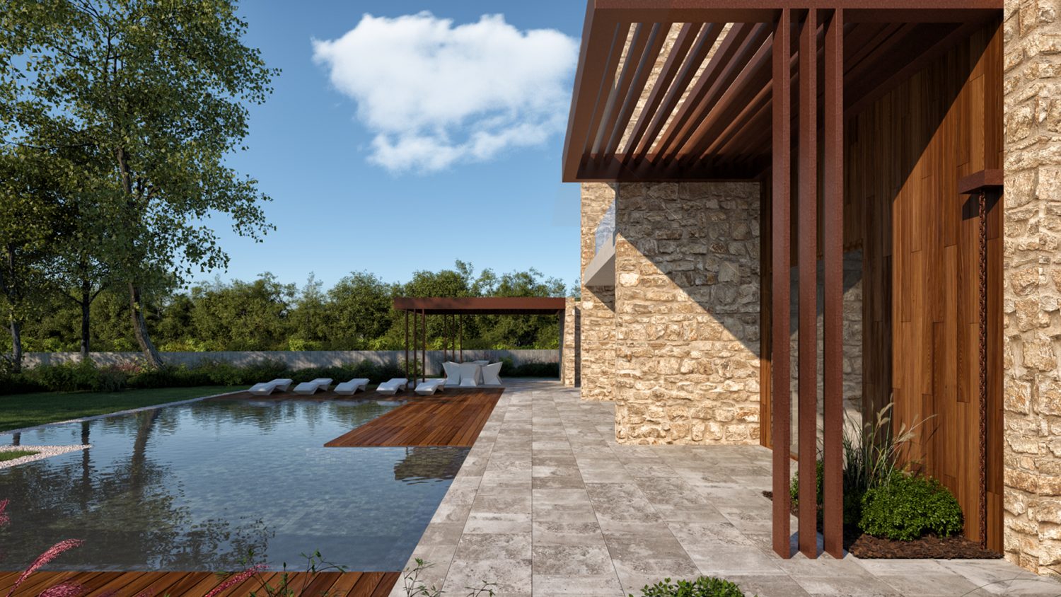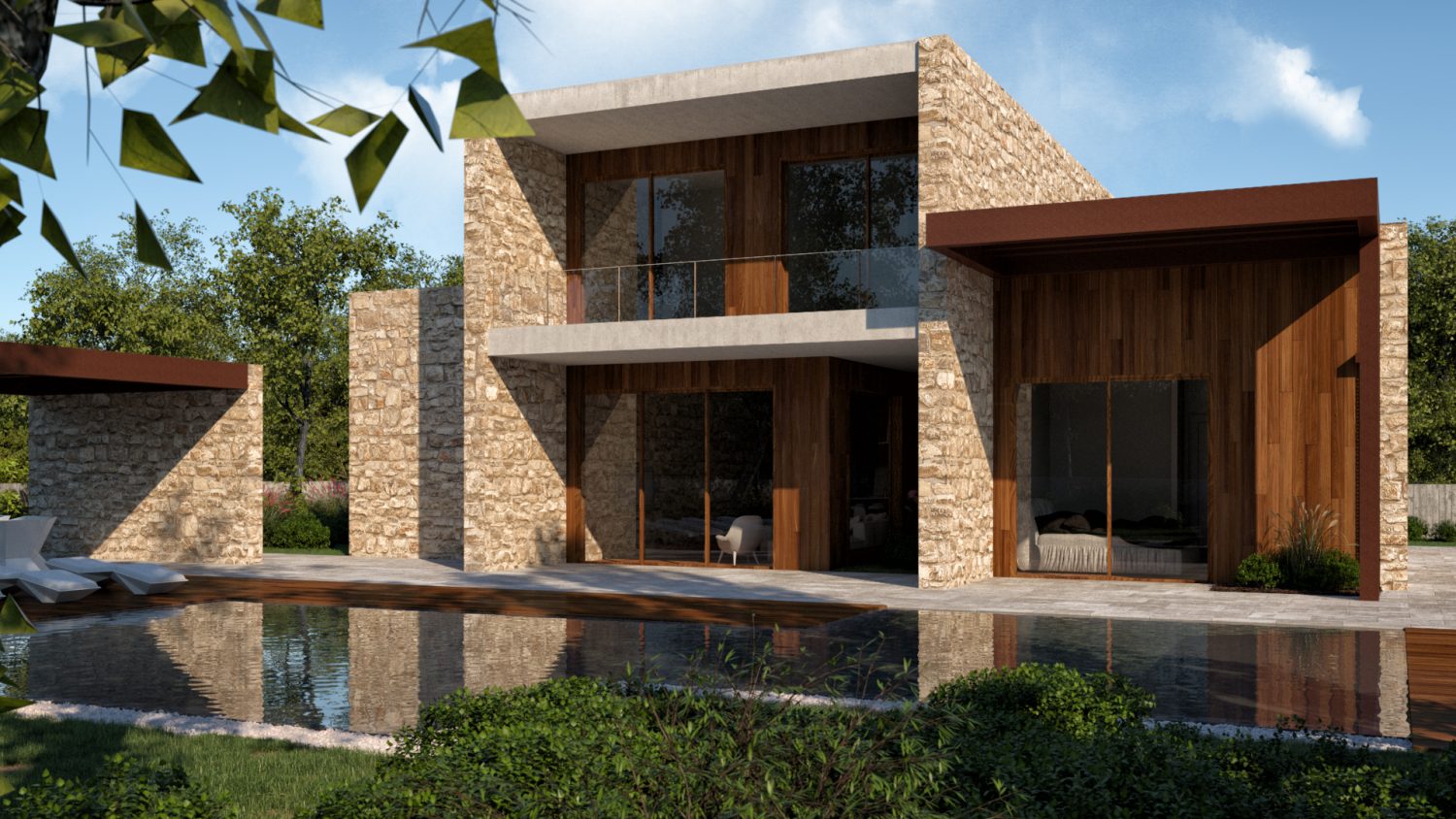 The design set out an ingenious layout that embraces the mild inclination of the land whilst optimizing the views and privacy of the property. The house is designed in a traditional stone and exposed concrete theme with wood cladding to highlight the walls enveloping the front facade and the ground floor bedroom bringing a touch of luxury to the house.