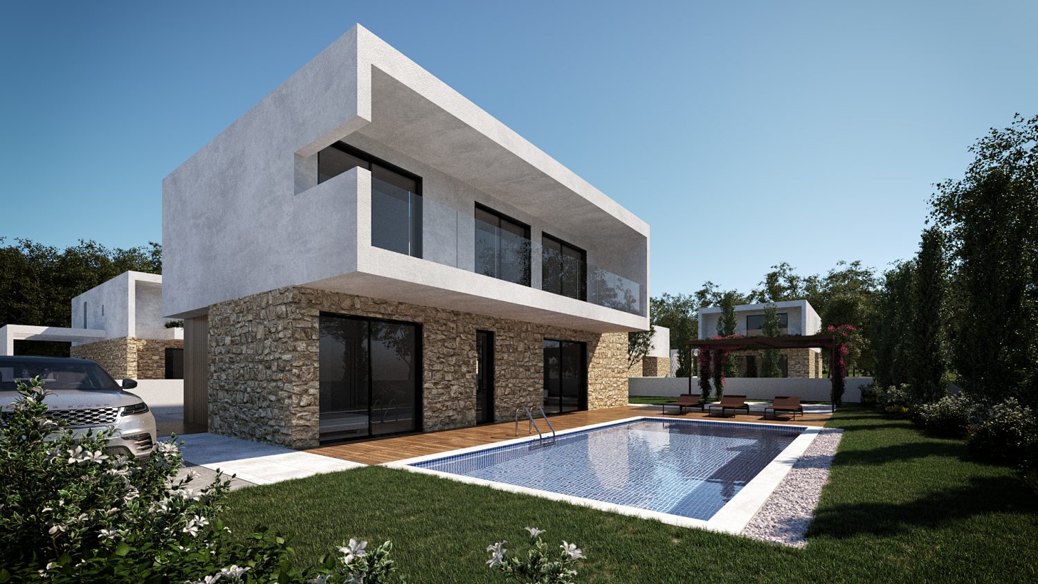 Stylish and elegant, Melody villas is a comfortable project situated in Konia area of Paphos with mixed hills and sea views. It is just a 10 minute drive to Geroskipou beach, so handy for those wanting to stretch their legs, and perfect for dining out in the evenings. The swimming pool is great for keen swimmers wanting to relax during the warm summer days and the terrace a delight for enjoying the country and sea views. The interiors have lovely modern finishes and are beautifully designed, with a relaxed atmosphere, the three bedrooms are situated on the second floor of the villas, with the option to add a 4 bedroom on the ground floor.