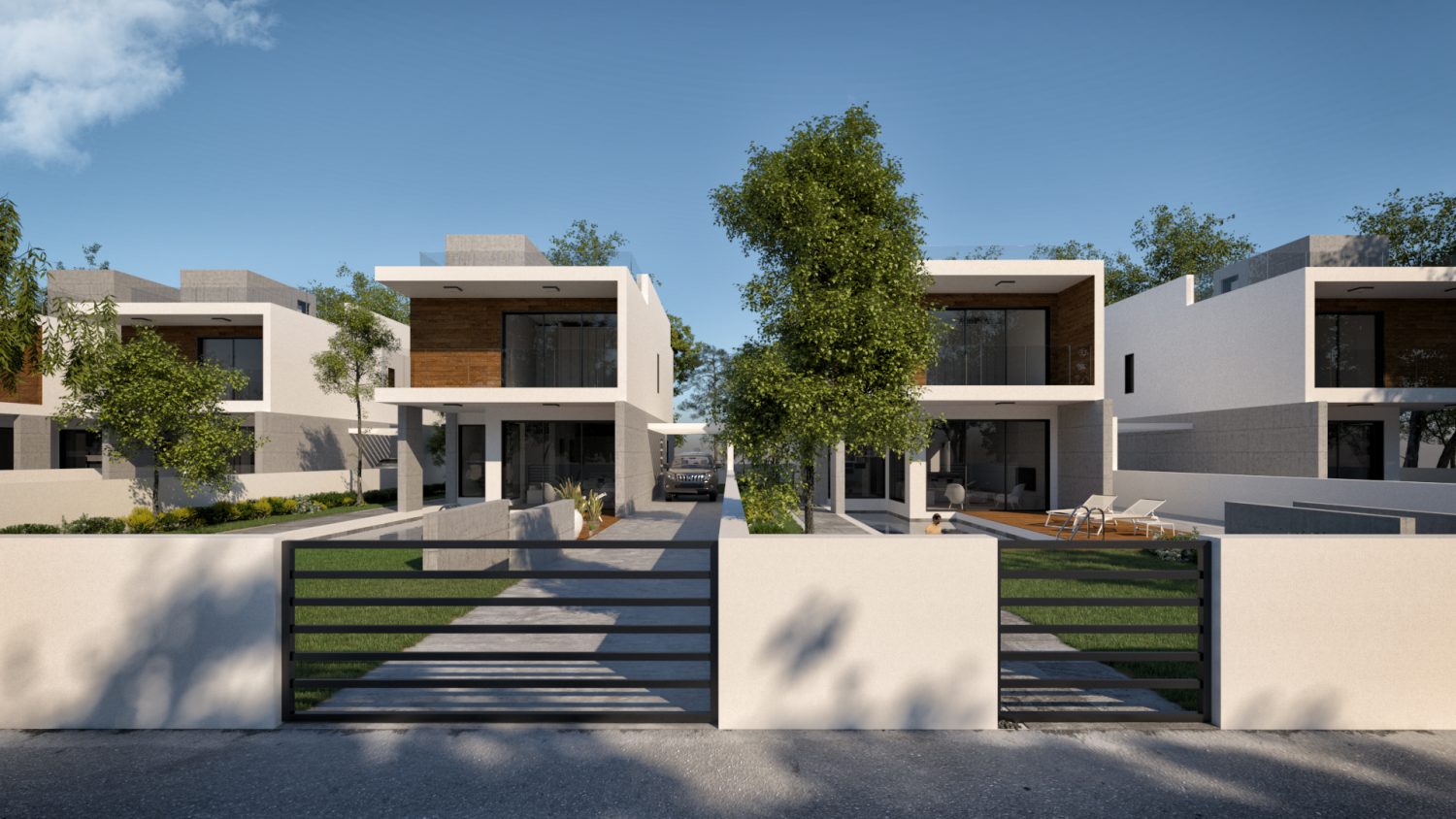 Project consists of 5 detached 2 storey 3 bedroom villas. On the ground floor you will find a spacious living room, overlooking the pool area, separate kitchen/dining zone and guest WC. On the first floor there are three double bedrooms and two bathrooms (en-suite bathroom/shower room in the master bedroom plus a separate shower room). Each villa has a roof terrace, where you can enjoy fabulous Cyprus sunsets and spend lovely summer evenings with your friends and family. Each villa has a spacious garden area, where private swimming pool can be built as an optional extra.